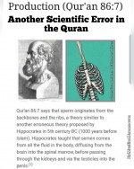 The Qur’an states, incorrectly, that semen originates from somewhere between the backbone and ribs. Today we know sperm comes from the testicles and semen from various glands behind and below the bladder, which is not between the backbone and ribs.