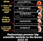 One, where is the woman’s egg is this process?? According to the Quran, she is just an oven!! Absolute Bullshit. Then the suggestion that the clot bones and THEN covered it with meat…absolute Bullshit. This used to be the medical knowledge of ancient Persia who were years ahead of Arabia. But still scientifically incorrect. Go take a look at the foetus development photos and show us where the bones come then the meat. The bones grows gradually from within the foetus .