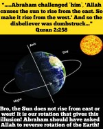 Abraham said, ‘Indeed Allah brings the sun from the east; now you bring it from the west.’ So the disbeliever was overwhelmed [by astonishment], and Allah does not guide the wrongdoing people. Quran 2:258