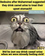 But Muhammad claimed it is a treatment to stomach upsets. Here is the evidence and the story has a disturbing ending. But we will discuss it another day. “Some people from the tribe of ‘Ukl came to the Prophet and embraced Islam. The climate of Medina did not suit them, so the Prophet ordered them to go to the (herd of milch) camels of charity and to drink, their milk and urine (as a medicine).” Sahih Bukhari 8:82:794 ” Anas b. Malik reported that some people belonging (to the tribe) of ‘Uraina came to Allah’s Messenger (may peace be upon him) at Medina, but they found its climate uncongenial. So Allah’s Messenger (may peace be upon him) said to them: If you so like, you may go to the camels of Sadaqa and drink their milk and urine. They did so and were all right.”