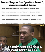 3. We have so much evidence of human evolution right now. But not one single evidence that we came from mud, dirt, or clay as the Quran claims. Again, the Quran claim came from a the belief from the ancient times that we are made from these things – why? Ancient people who opened old graves would see bones and soil. So, they speculated our composition. But the soil they see is product of maggots and decomposition. We are 99% water, so organic matter. Muhammad did not know that, so Allah did not know that.